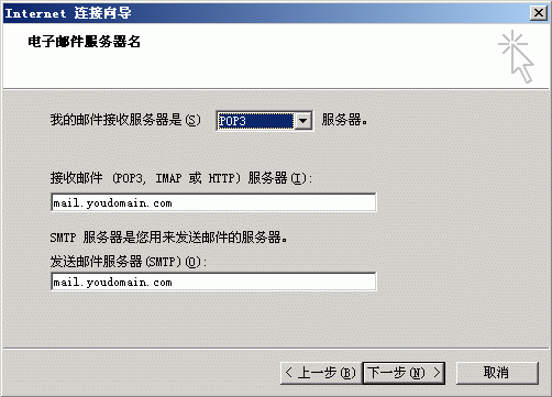 4.点击下一步弹出以下窗口,我的邮件接收服务器选择是“POP3”服务器;接收邮件服务器地址填写:mail.youdomain.com;发送邮件服务器地址填写:mail.youdomain.com; (请注意将“youdomain.com”替换为您的域名)