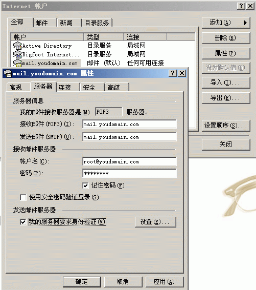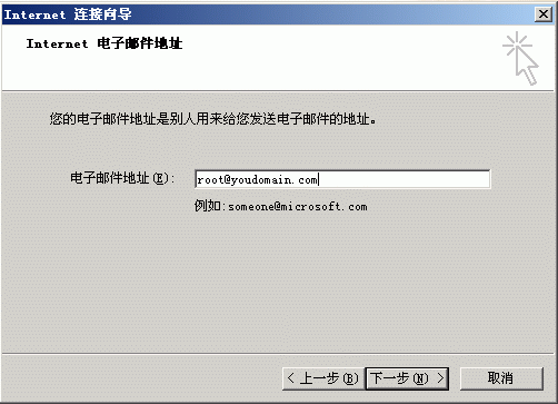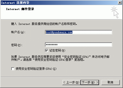 5.点击下一步弹出以下窗口,在帐户名处填写您的邮件地址(例如“root@youdomain.com)请注意邮件后缀要填写;在密码处输入您已设定的root@youdomain.com的密码。如:[图4-1](请注意将“youdomain.com”替换为您的域名)