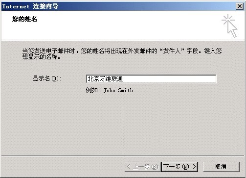 2.如下图所示,弹出Outlook Internet连接向导;在显示名处输入您的个人名称或此邮件地址代表的部门名称。如(图一):